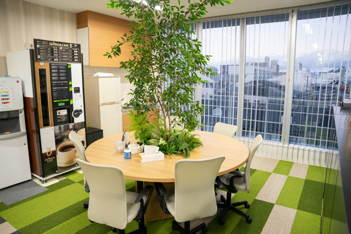 ホテルのロビーを思わせる、スタイリッシュなオフィス。緑を基調とした空間に観葉植物が溶け込み、自然と心がほどけていく。「出社したくなる職場」とは、こういう場所を指すのだろう。