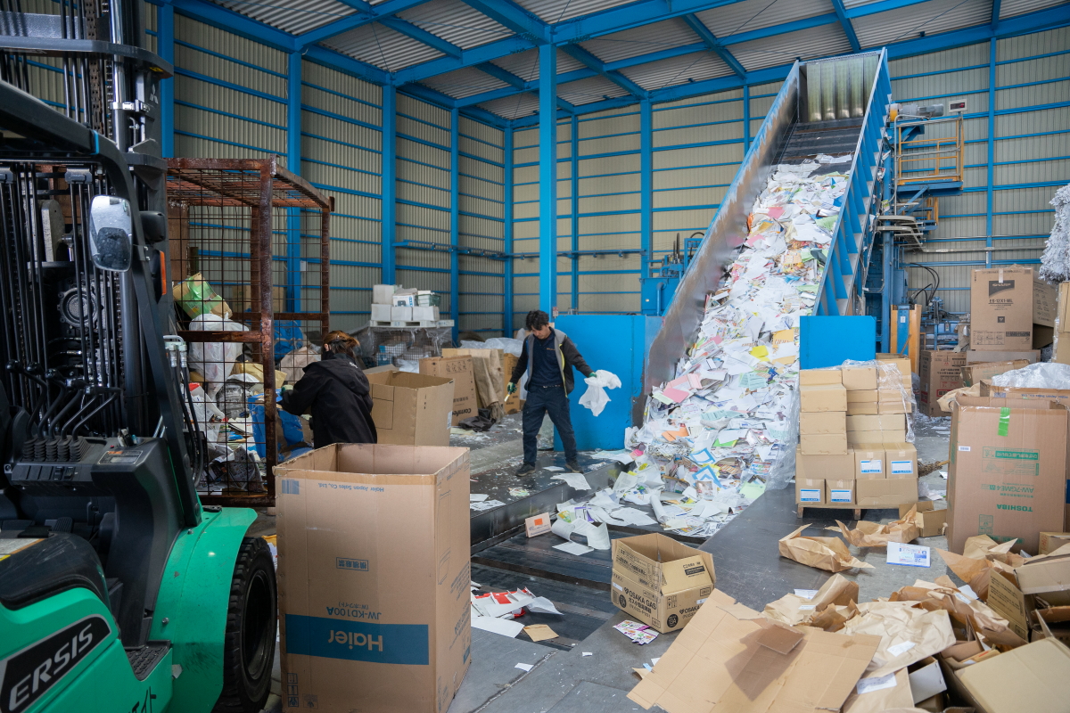 南大阪を中心に、商業施設や印刷会社などから古紙を回収。種類ごとに丁寧に分別・選別を行い、大手製紙メーカーへとつなぐことで、紙資源の循環を支えている。環境への意識が今ほど高くなかった時代に創業して以来、地道な取り組みを積み重ね、地域に根ざしたリサイクルの仕組みを築いてきた。